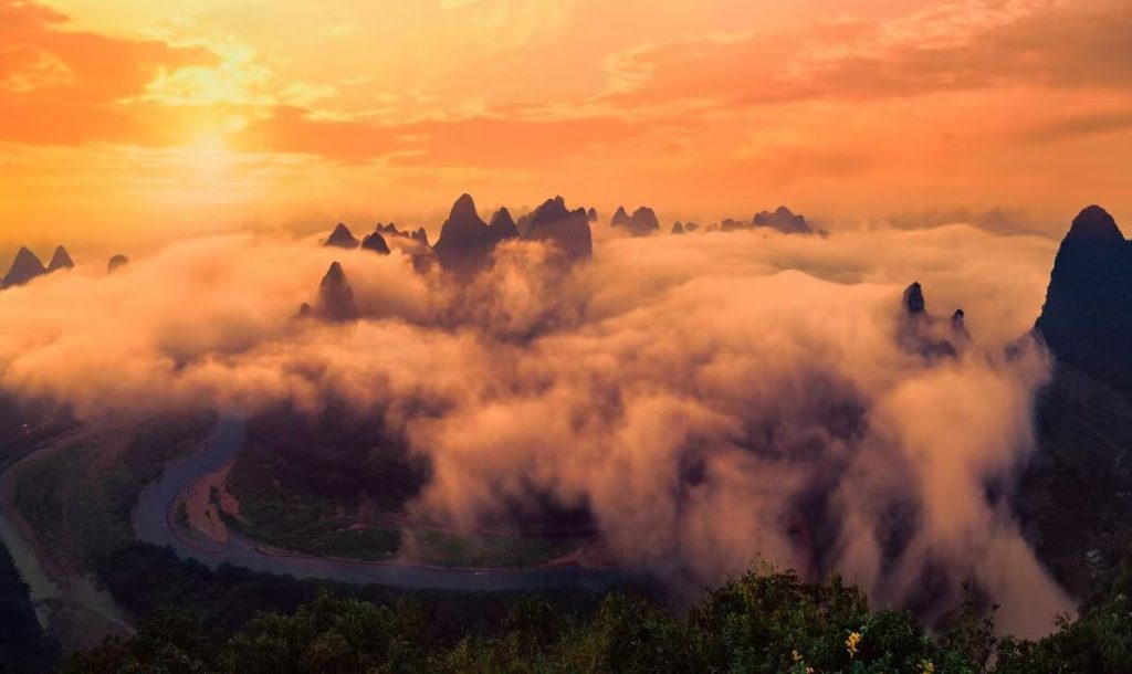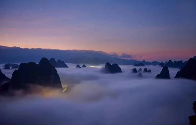 The sea of clouds, light and colourful haze here is exceptionally beautiful. Photographers say it has the most beautiful sunrise in Yangshuo, with the haze when there are no clouds.