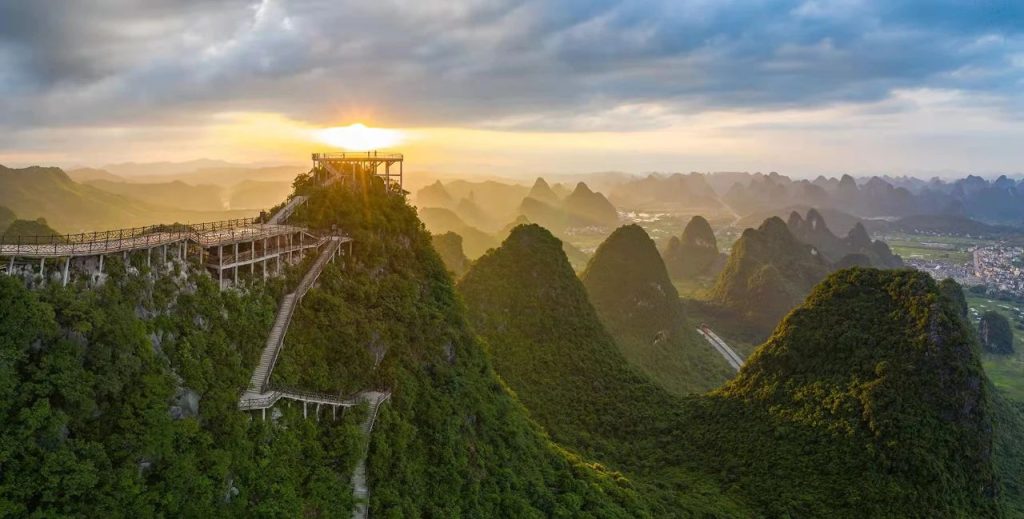 Guilin’s first mountaintop sky park. You can take the ropeway, walk the glass stack, walk in the forest, Ruyi cloud top, overlooking the peaks and through the forest.